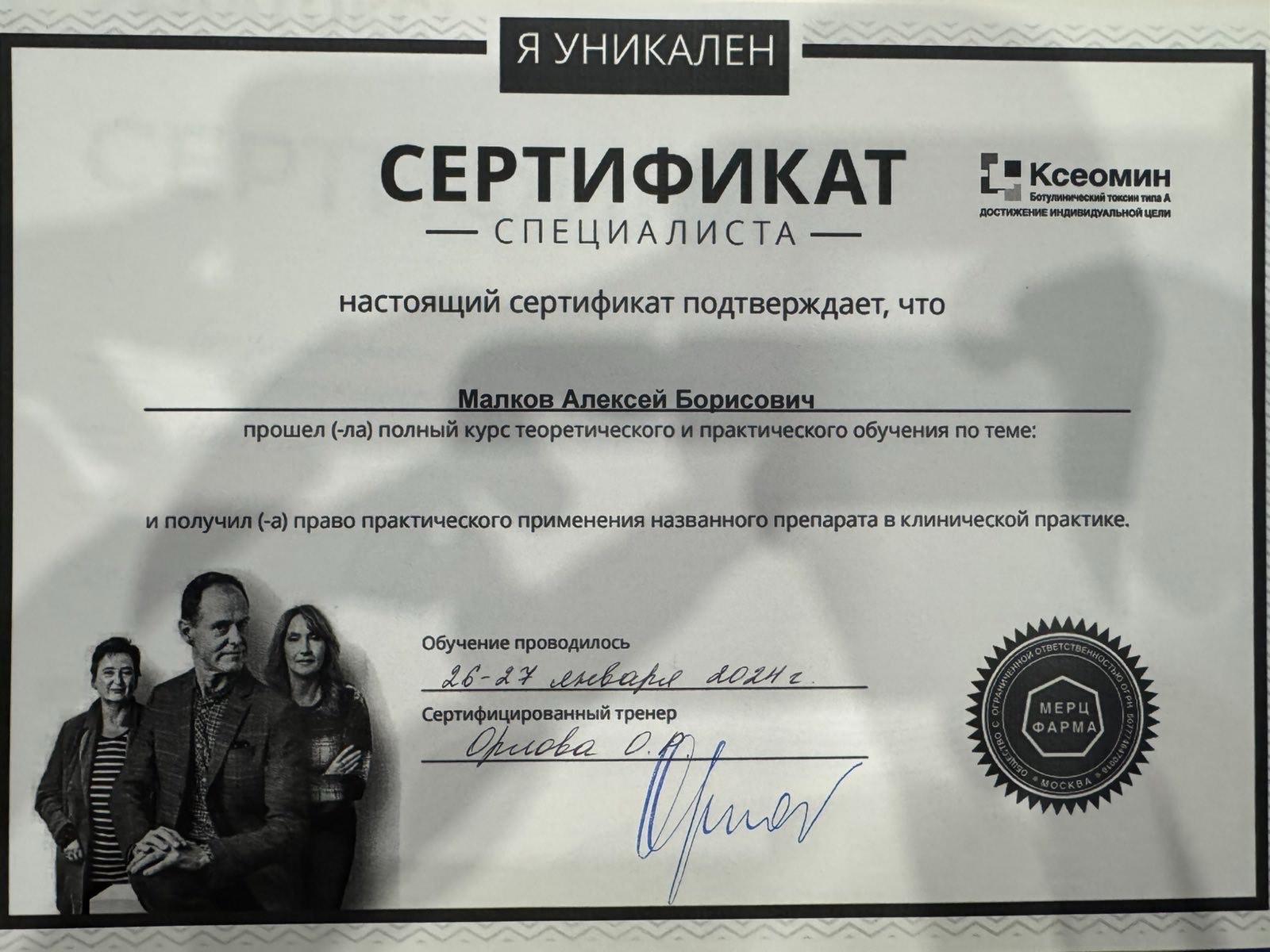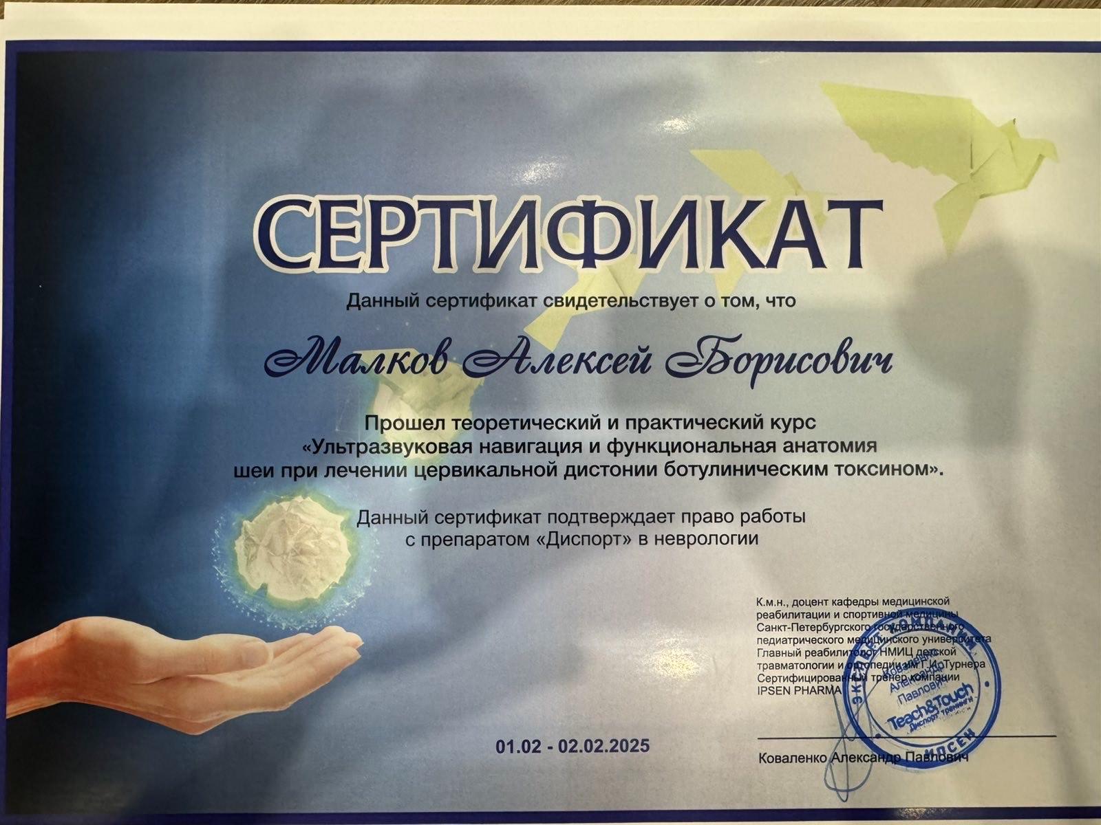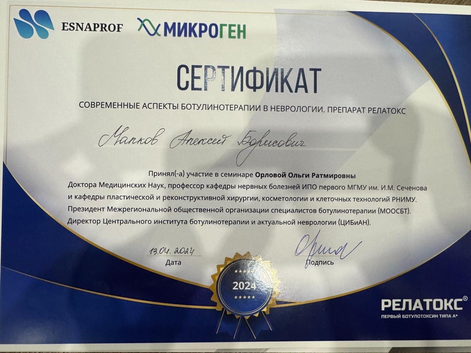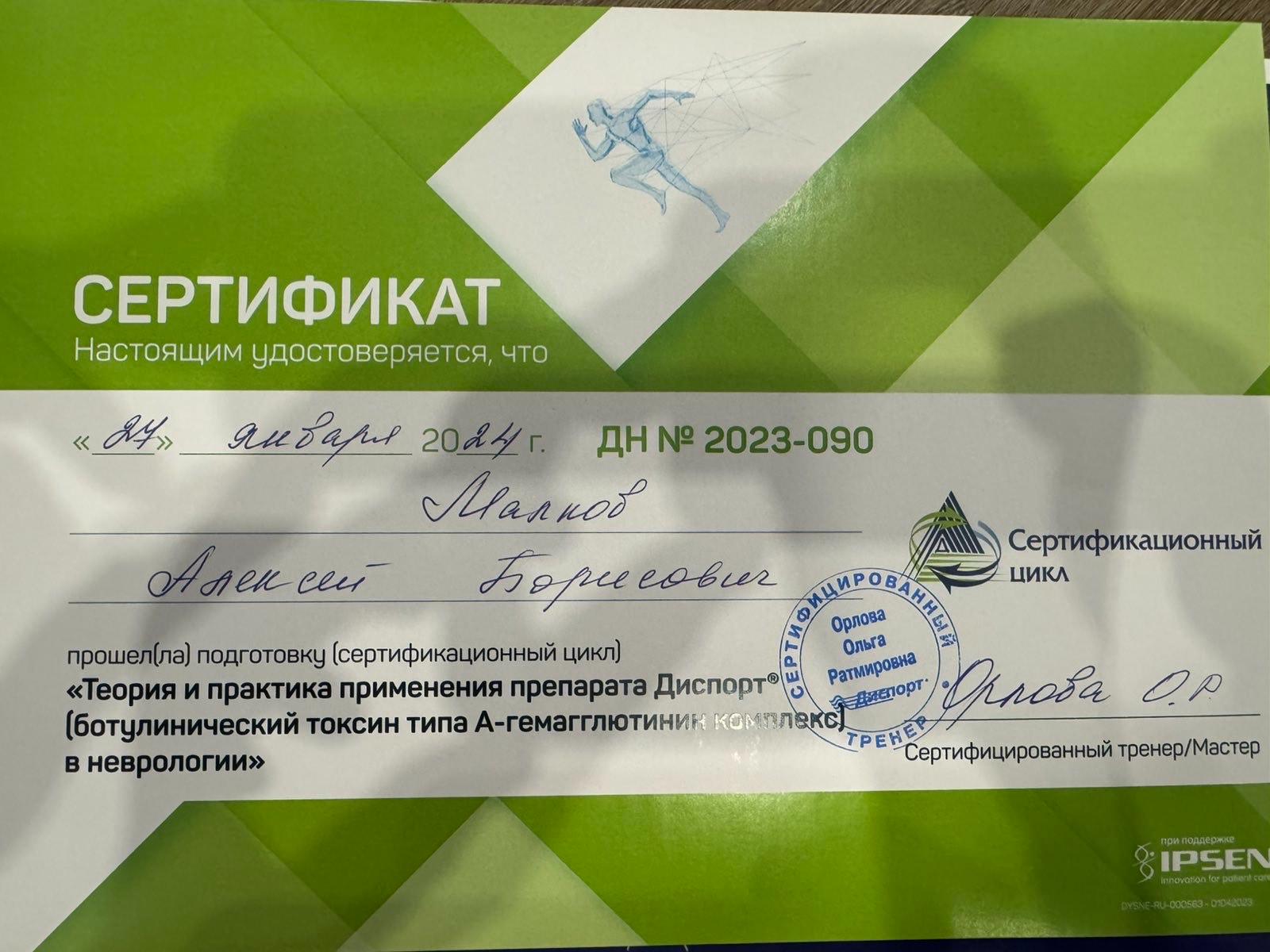 2024 г – Сертификационный цикл "Теория и практика применения препарата Диспорт (ботулинический токсин типа А-гемагглютинин комплекс) в неврологии".