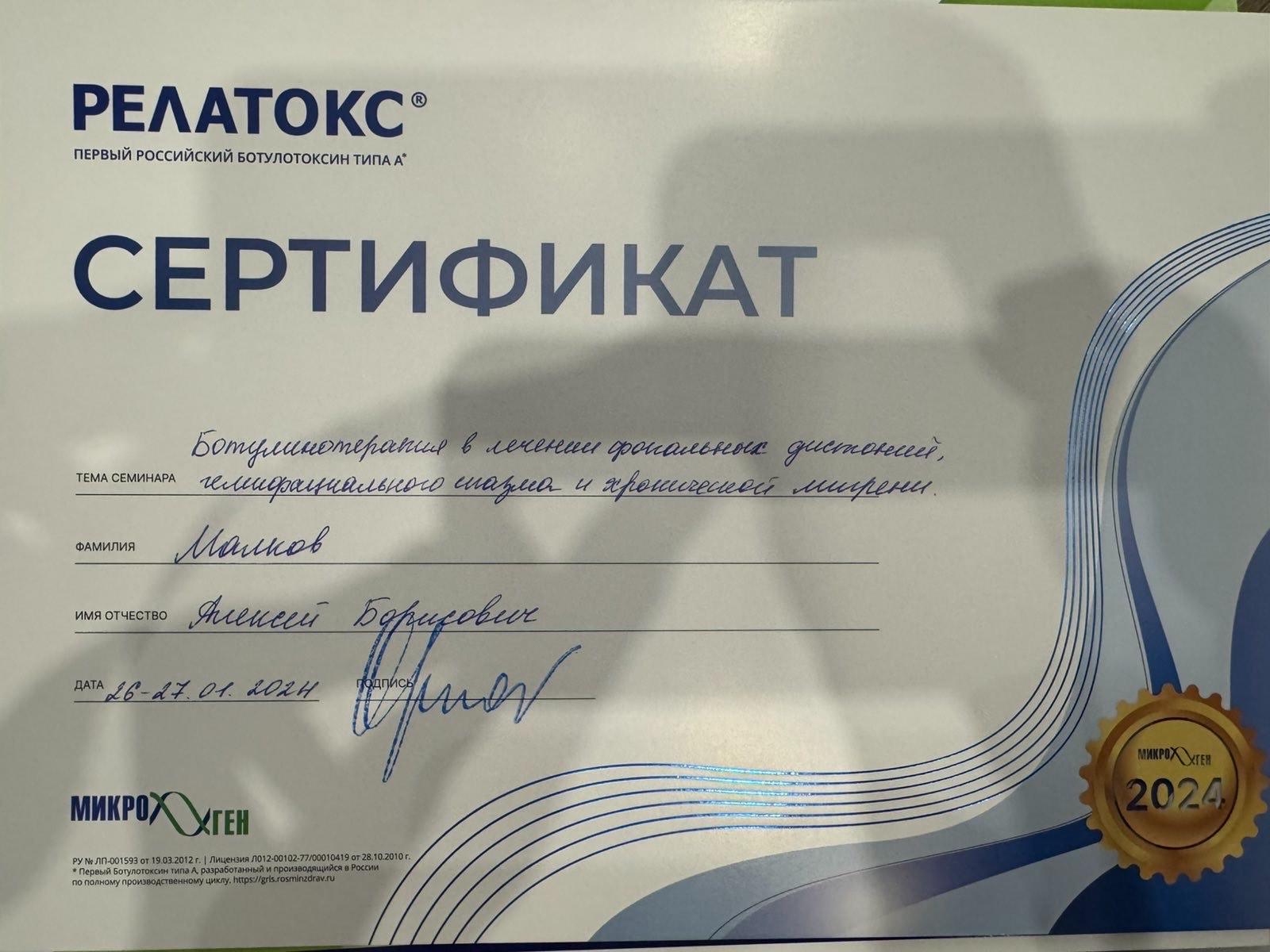 2024 г – Научно-практическая конференция "Ботулинотерапия в лечении фокальных дистоний, гемифациального спазма и хронической мигрени" (Релатокс).