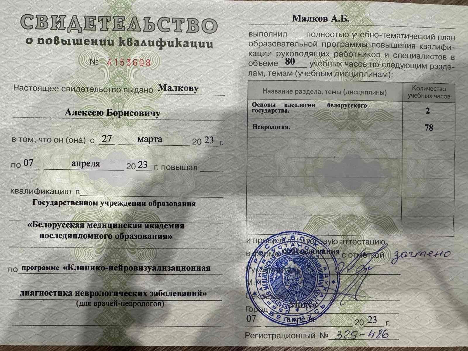 2023 г – Повышение квалификации по программе "Клинико-нейровизуализационная диагностика неврологических заболеваний", БелМАПО.