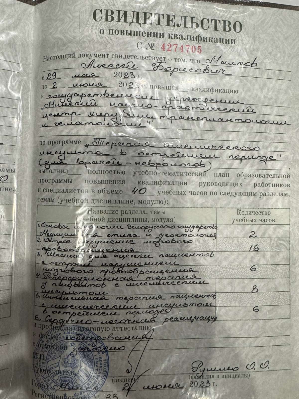 2023 г – Повышение квалификации по программе "Терапия ишемического инсульта в острейшем периоде", Минский научно-практический центр хирургии, трансплантологии и гематологии.