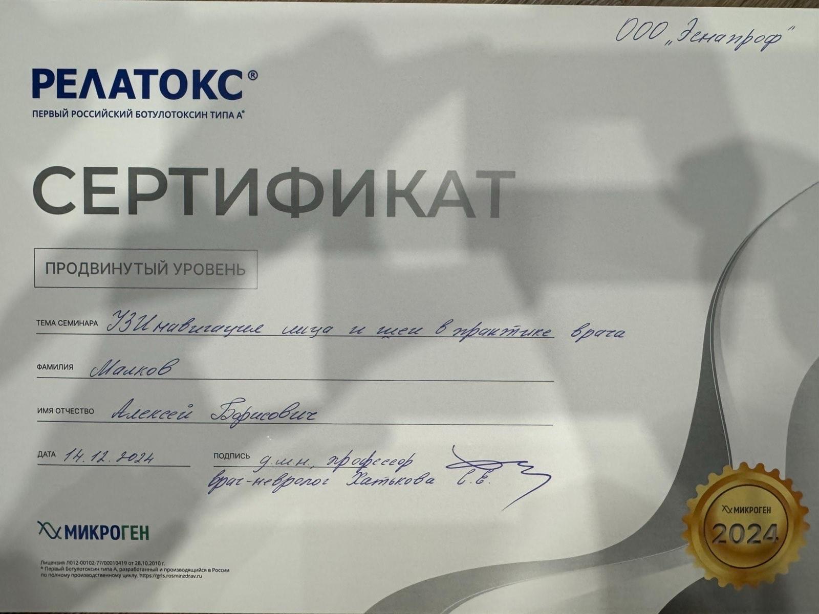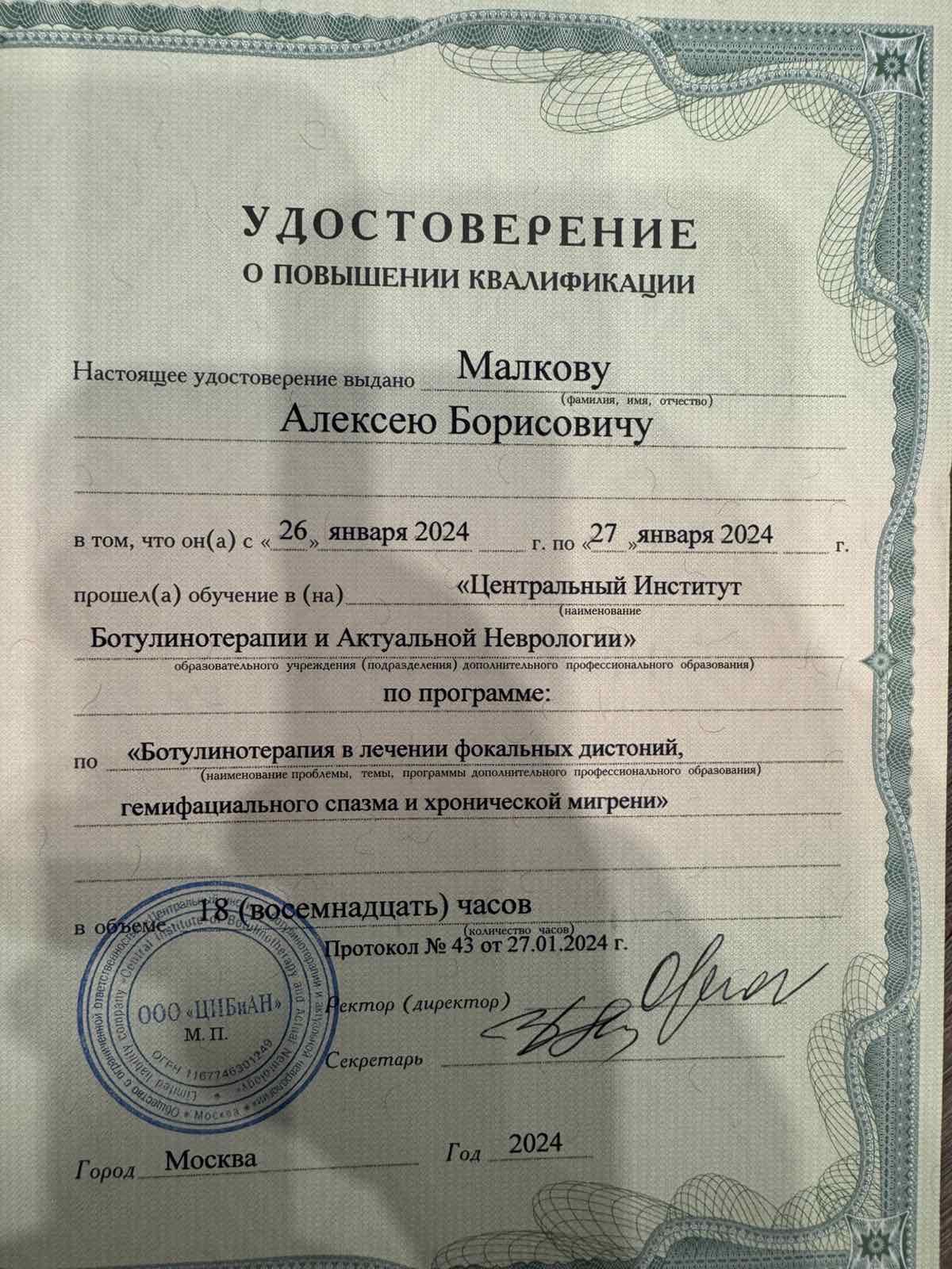 2024 г – Повышение квалификации по программе "Ботулинотерапия в лечении фокальных дистоний, гемифациального спазма и хронической мигрени", Центральный Институт ботулинотерапии и актуальной неврологии.